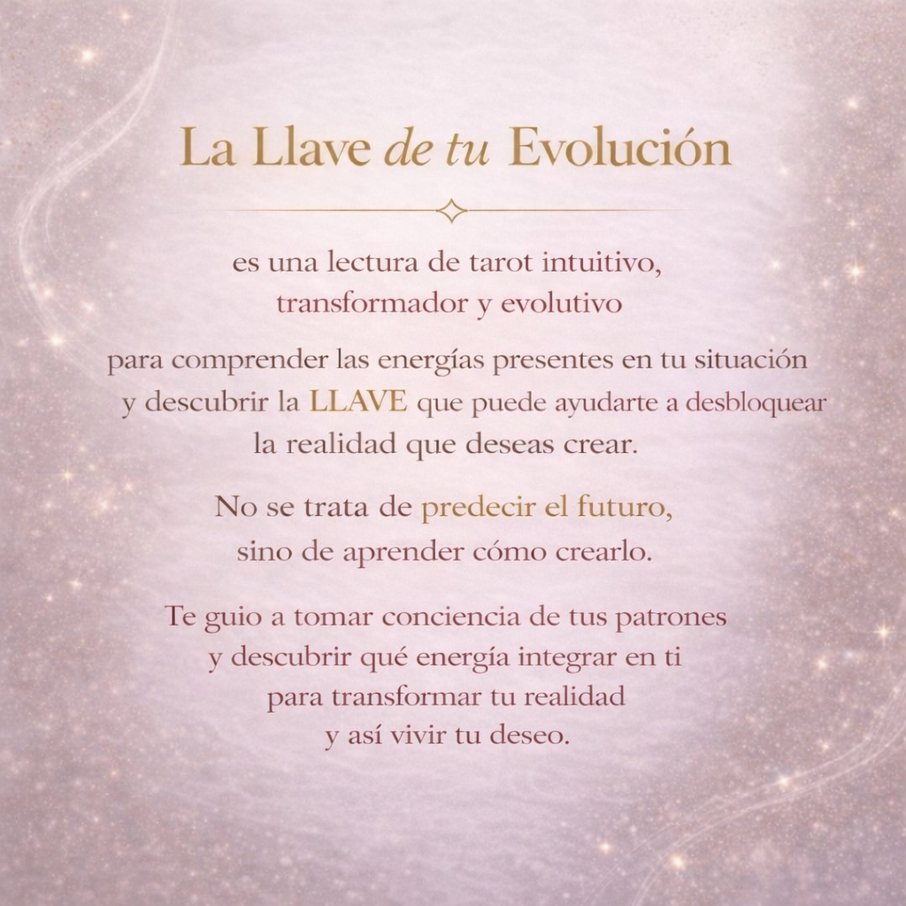 La Llave de tu Evolución es una lectura energética de tu situación actual desde una tirada de Tarot Consciente, Intuitivo, Terapéutico, Metafísico y Evolutivo.